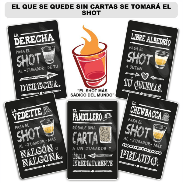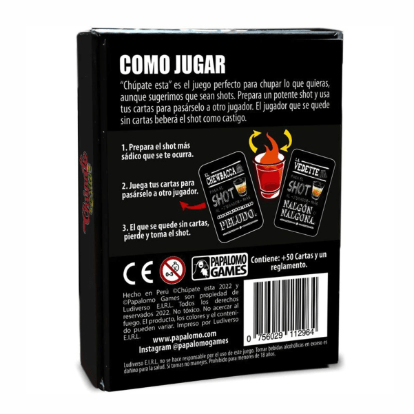 «Chúpate esta» es el juego de mesa perfecto para chupar lo que quieras, aunque sugerimos que sean shots. Prepara un potente shot y usa tus cartas para pasárselo a otro jugador. El jugador que se quede sin cartas beberá el sádico brebaje como castigo.