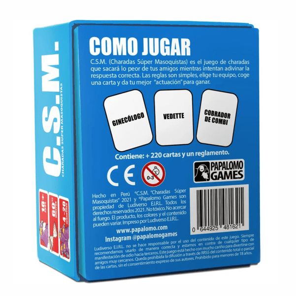Juego de mesa Charadas Súper Masoquistas (C.S.M.) es el juego de charadas que sacará lo peor de tus amigos mientras intentan adivinar la respuesta correcta. Las reglas son simples, elige tu equipo, coge una carta y da tu mejor “actuación” para ganar. El grupo que acumule 8 puntos ganará el juego.