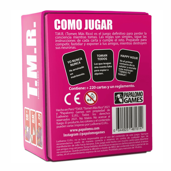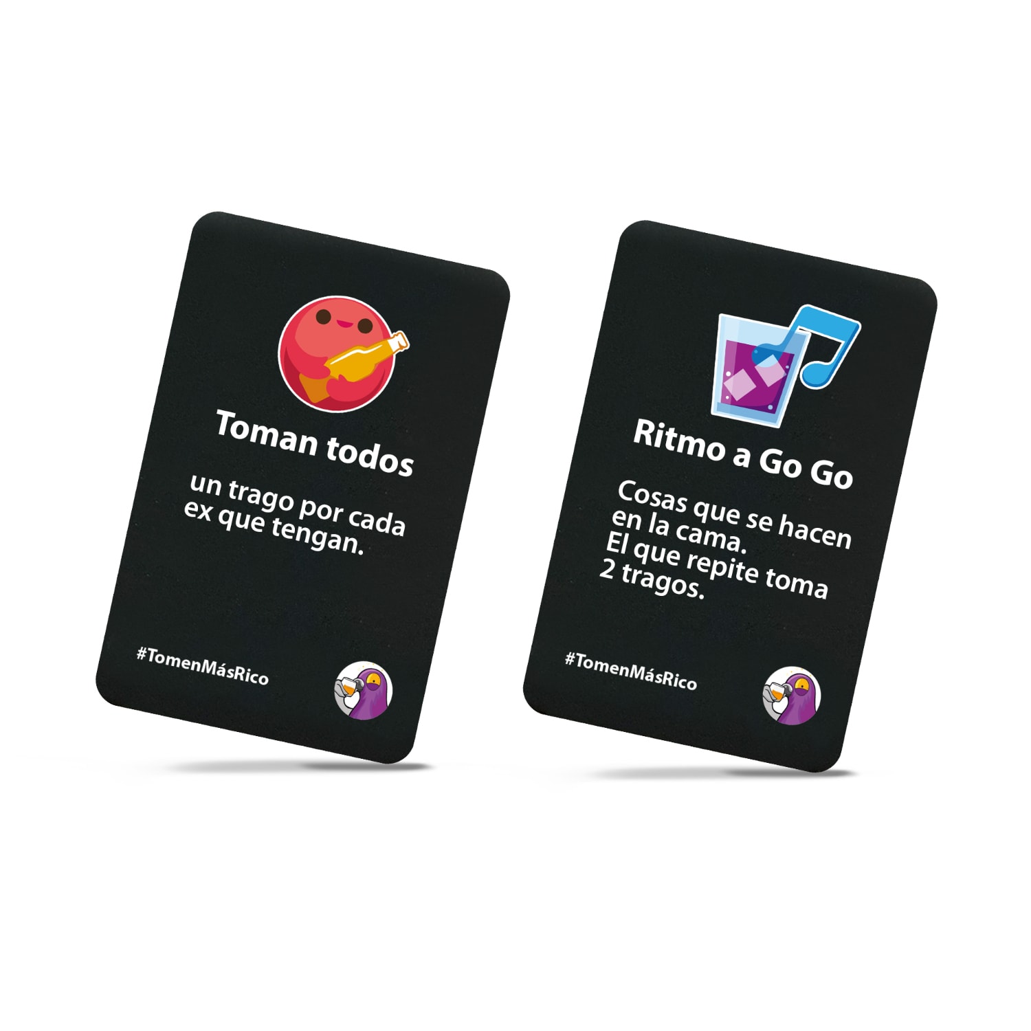 Tomen Más Rico (T.M.R.) es el juego definitivo para perder la conciencia mientras tomas. Las reglas son simples, sigue las instrucciones de cada carta y cumple el reto. Prepárate para competir, fastidiar y exponer a tus amigos, mientras destruyen sus neuronas. En este juego encontrarás 4 categorías: Happy Hour, Yo Nunca Nunca, Ritmo a Go Go y Toman Todos. Debes elegir el mazo con tu categoría favorita, mezclar las cartas, colocarlas al centro y comenzar a destruir tus neuronas junto a tus amigos. Estas Drink Cards pueden ser jugados por hasta 20 amigos. Se recomienda tomar con moderación. Si tomas no conduzcas.
